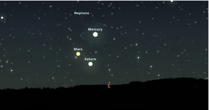 Neste sábado (18), ocorre um pequeno alinhamento, com Saturno, Marte, Mercúrio e Netuno surgindo bem próximos no céu, acima do horizonte leste, até serem encobertos pela luz do Sol.